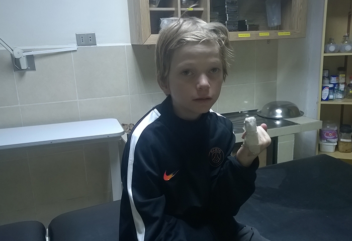 La veille du départ, je voulais aller aux toilettes et papa m’a ouvert le doigt en le coinçant dans la porte de la salle de bain. Le lendemain je suis allé à la clinique, ils m’ont fait une piqure d’anesthésie dans le doigt ouvert pour me retirer la peau infectée.