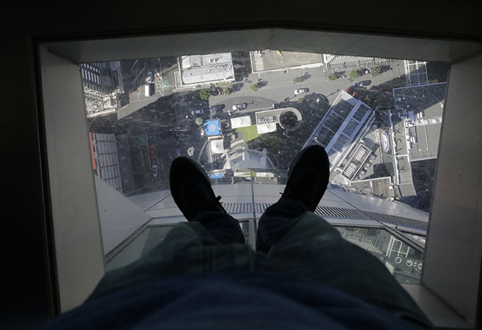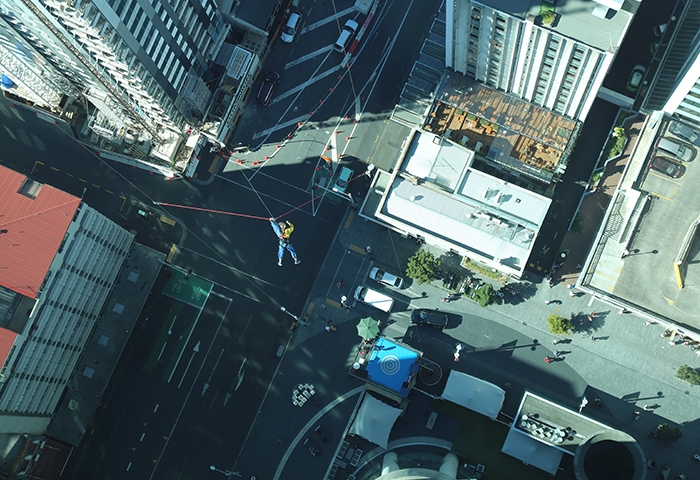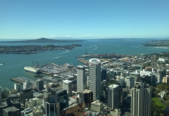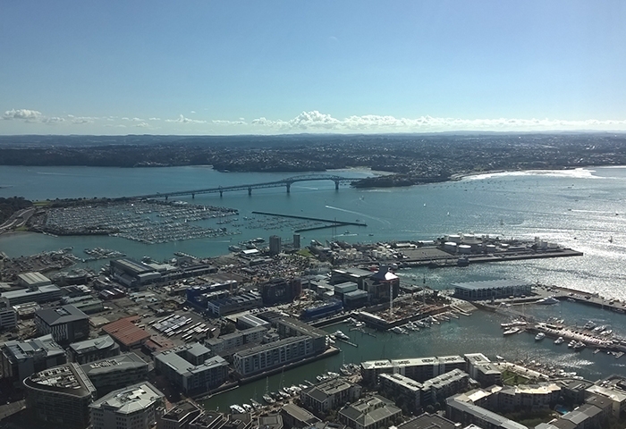 22 heures de décalage horaire entre Papeete et Auckland, soit une journée dans la vue en voyageant d’est en ouest… mais pas de jet lag, c’est au moins ça ! Pas simple de trouver un hébergement pour 3 nuits dans cette ville car nous arrivons non seulement la veille d’un jour férié mais surtout au moment des World Masters Games, une compétition qui accueille tous les 4 ans les sportifs vétérans du monde entier et qui est organisé par les Kiwis cette fois-ci… Les jeux olympiques des vieux (les plus de 30 ans, SIC !) pour ainsi dire ! Y a du monde en ville… Nous savions que le budget allait grimper en flèche ici, mais dans ces conditions c’est encore pire. Nous arrivons néanmoins à nous loger en Airbnb pas trop loin du centre, dans le quartier de Remuera, dans une grande et jolie maison en bois comme on peut en voir partout dans ce pays. La ville a la réputation d’être parmi celles où il fait le meilleur vivre dans le monde et nous ne le démentirons pas. Auckland, construite sur un isthme, est vraiment très belle…. Les collines des anciens volcans qui l’ont formée… La mer Pacifique, les îles et presqu’îles qui composent cette cité attirent les navigateurs et les bateaux à quai downtown sont plus incroyables les uns que les autres. Même si cette ville concentre plus d’un tiers de la population du pays (qui compte 4,5 millions d’habitants seulement), on s’y sent vraiment bien. On ne sait pas si c’est dû à ce jour férié le 25 avril, mais les gens sont cools ici, décontractés… Dans le centre-ville, multitude de bars et restaurants en terrasse sur les quais, de Viaduct Harbour à Silo Park en passant par Wynward Quarter… On se verrait bien s’y installer ! Sauf que nous ne sommes pas les seuls à y penser, que l’immigration est en forte croissance et que les prix de l’habitat y sont aussi élevés qu’à Paris. Sans doute trop tard pour nous,… Dommage ! Ici, les retraités ont droit à la gratuité dans tous les transports et peuvent prendre le ferry quand ils le veulent pour aller bookiner sur la plage d’une des îles à 15 ou 30 minutes, comme cet anglais ancien magistrat d’origine anglaise que nous avons croisé sur Waiheke. Mais bon, on n’en est pas là ! Pour prendre la dimension de la ville, nous sommes montés sur la Skytower qui offre du haut de ses 325 mètres un panorama à 360°.