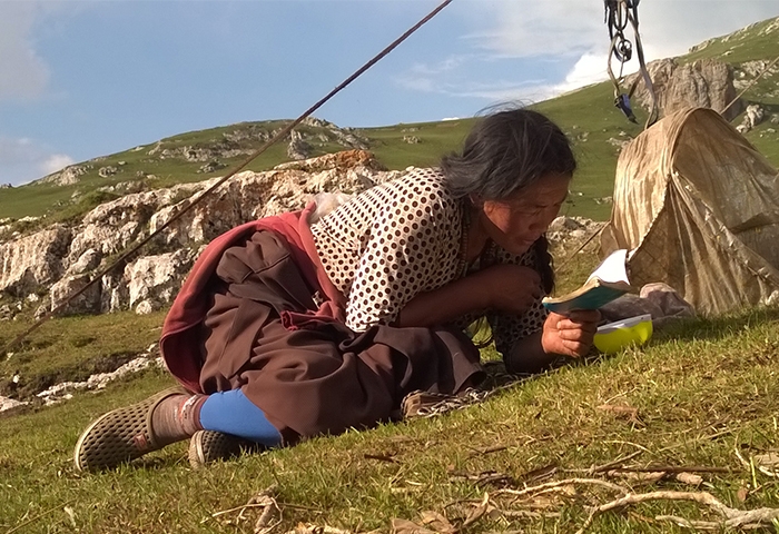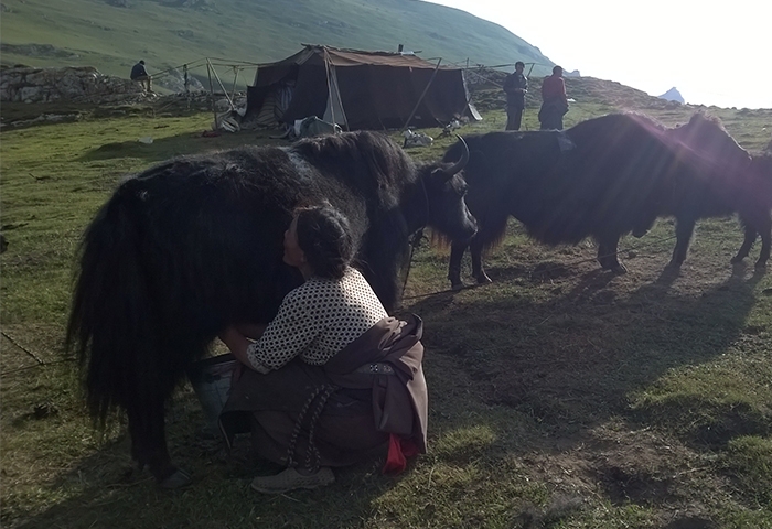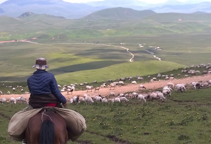 Langmusi est également réputée pour ses trekkings, à pied ou à cheval dans la montagne. Nous avons décidé de partir deux jours à cheval visiter les nomades éleveurs de yaks. Le nomadisme est une particularité de la culture tibétaine. La vie des nomades suit le rythme des saisons. A chaque famille est attribuée au moins trois pâtures pour faire paître leurs troupeaux de yaks et de moutons. En été, ils bougent tous les 40 à 50 jours pour changer de pâture et utilisent leurs yaks pour transporter leur tente et leurs affaires.