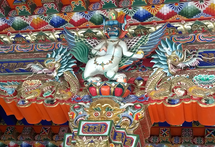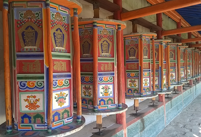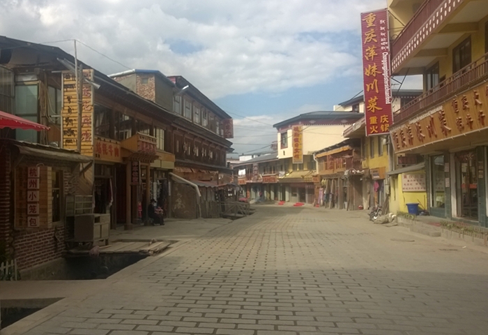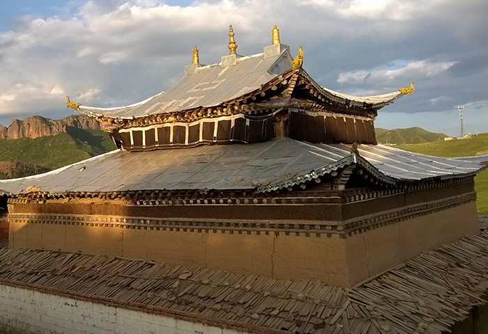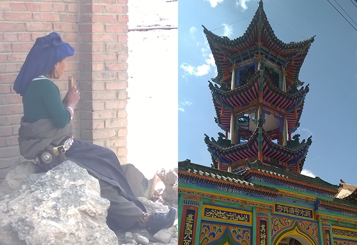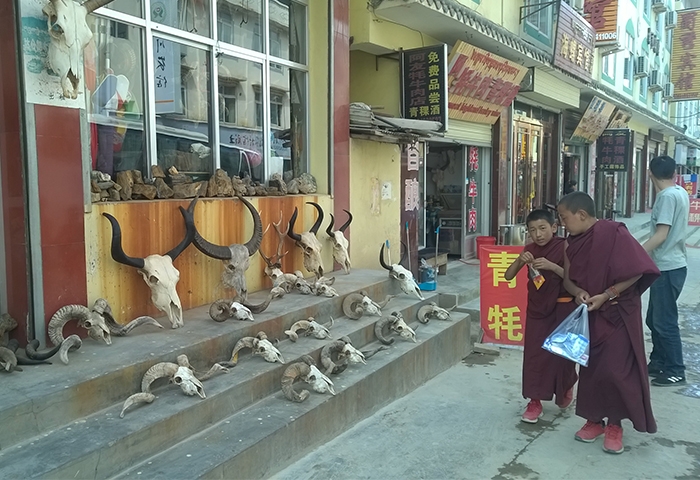 L’auberge est également à proximité du quartier musulman reconnaissable à ses maisons jaunes et sa mosquée d’architecture chinoise. De l’autre côté de la rivière, face à la terrasse de notre auberge, nous apercevons également le Serti Gompa, côté Gansu, un autre monastère, datant du 17ème, plus éclatant avec ses temples aux toits dorés et aux peintures de toute beauté. Là encore, pas de photo possible des moines à la prière jouant de leurs instruments, ni des femmes d’un certain âge qui font le tour du Kora (monastère) en utilisant des bouliers servant à se souvenir du nombre de tours effectués, comme un chapelet. Le bouddhisme a au moins cela de bon : les rites relatifs à la prière se pratiquent beaucoup dehors et prier tout en marchant est fort bien pour la santé ! D’ailleurs, outre les drapeaux de prières qui flottent en haut de longues perches plantées dans le Latza (cairn ou couverture de pierres en l’honneur des dieux, généralement situé au sommet d’un col) dont les cinq couleurs symbolisent les éléments et sur lesquels des formules sacrées sont inscrites, animées par le vent et emportées vers les dieux, nous trouvons souvent aussi au cours de nos ballades des petits carrés de papiers sur lesquels sont écrites des prières. Une coutume tibétaine étonnante qui laisse des traces dans la nature… Beaucoup de visiteurs viennent à Langmusi afin d’assister à une cérémonie traditionnelle tibétaine d’enterrement céleste qui consiste à rendre le corps des morts à la Nature en les livrant aux rapaces dans les montagnes. Sans regret, nous n’aurons pas assisté à cela !