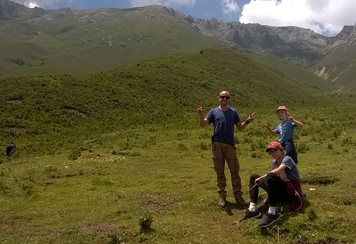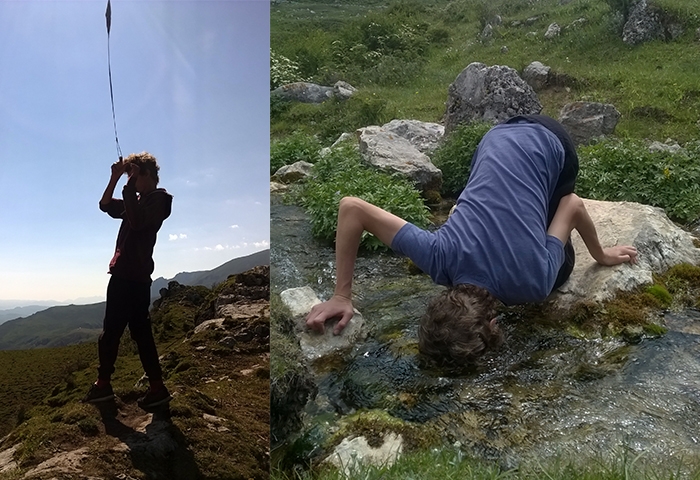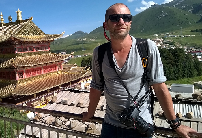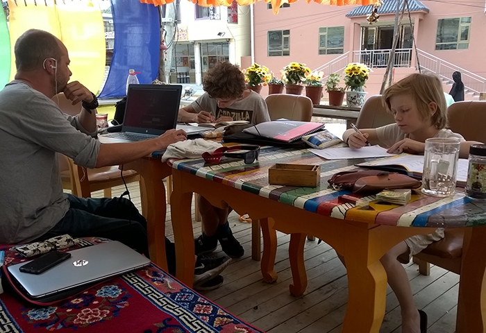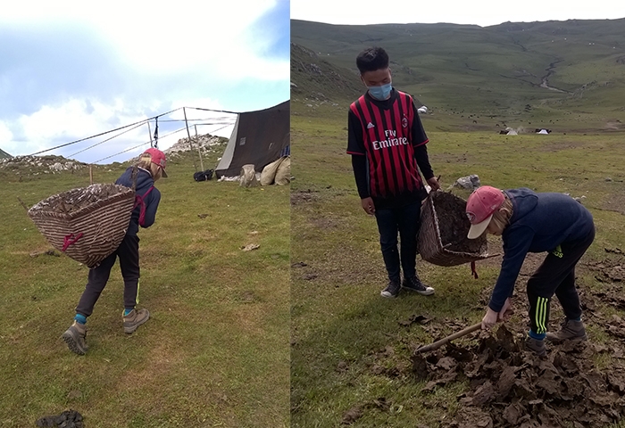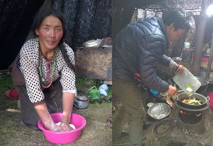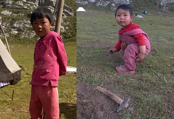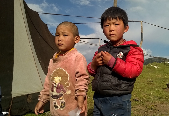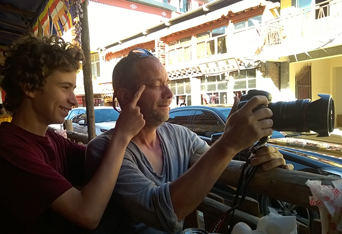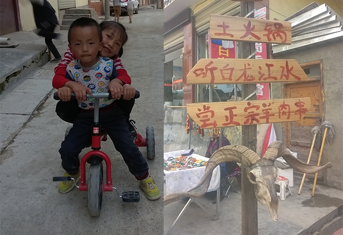 Accompagnés de notre guide Taïchi, nous remontons d’abord la rivière du dragon blanc jusqu’à sa source en nous arrêtant pour une première halte dans la tente où une jeune maman nous prépare le déjeuner. Son bébé emmitouflé dans un coin de la tente attend sagement tandis qu’elle nous prépare la soupe aux tomates et à l’œuf ainsi qu’un riz aux légumes et pomme de terre. Tout est cuit sur le fourneau central de la tente, cela prend donc un petit peu de temps ! En fin de journée, c’est une autre femme qui nous accueille, à 3800 mètres d’altitude. Les hommes sont peu présents, ce sont les femmes qui assurent la quasi-totalité du travail. Les hommes se limitent à rassembler et surveiller le troupeau et passent souvent leur journée à boire le thé et à jouer aux cartes entre eux à Langmusi. Notre hôtesse a 40 ans, et vit dans une tente noire en poils de yaks. L’habitat y est précaire : un fourneau au centre, une grande paillasse sur sa droite dans toute la longueur de la tente, l’autre moitié à gauche étant divisée entre un espace de préparation alimentaire à même le sol (où sont entassés un bric-à-brac de bassines, bidons d’eau et aliments) et un tas de bouse de yaks séchée qui sert de combustible pour le fourneau. C’est ici que nous dormirons le soir, tous les quatre avec notre guide. Deux autres tentes à proximité, (en plastique cette fois) abritent d’autres familles, avec de jeunes enfants. Ce groupe a en charge un troupeau de 150 yaks environ. Plus bas dans la montagne, deux autres groupes de familles gèrent des troupeaux de 250 et 330 têtes. Dans la journée, toutes ces bêtes sont éparpillées dans les pâturages alentours. Ce n’est pas facile de communiquer car personne ici ne parle anglais. On essaie de de comprendre par les regards et les gestes. Les garçons apprennent à manier la fronde qui permet de lancer des pierres vers les yaks qui ne bougent pas ou qui ne vont pas dans la bonne direction au moment du rassemblement. Nous accompagnons notre hôtesse dans cette tâche le soir venu et Fantin est ravi de pourvoir apporter son aide afin d’attacher les femelles et les séparer de leur petit en vue de la traite le lendemain matin. La traite fait partie des nombreuses tâches quotidiennes des femmes. Le lait des yaks est meilleur le matin et notre hôtesse passera toute la matinée, de 6h30 à 10h30 le lendemain à traire ses bêtes à la main. Elle met le bébé yack au pis très brièvement d’abord afin de faciliter la traite, puis le sépare de sa mère le temps de la traire avant de le laisser enfin boire à son tour. Ce sont aussi les femmes qui fabriquent le fameux beurre de yak, vont chercher l’eau à la rivière, préparent les repas et collectent la bouse de yak. Nous serons mis à contribution dès le saut du lit afin de collecter les bouses séchées par le soleil depuis quelques jours et laisser la place afin d’étaler les fraîches laissées pas les yaks la nuit. Les montagnes sont très peu boisées et ce combustible s’avère efficace et eco-friendly… tant qu’il ne pleut pas et que les bousent peuvent sécher ! On se fait finalement à l’odeur…. Pour le dîner, notre hôtesse nous a préparé une soupe à base de pâte qu’elle a elle-même fabriquée, de légumes et de viande de yak. Nous nous rassemblons autour du fourneau pour manger avant de nous installer à touche-touche, tous les quatre, avec nos sacs de couchage sur la paillasse faite d’herbes, de brindilles et de bouse sèche. Taïchi nous recouvre de plusieurs épaisseurs d’édredons supplémentaires avant de s’installer à son tour à nos pieds. Il faut dire que la tente est loin d’être hermétique et pas de chauffage la nuit ! Personne ne se lèvera pour sortir aux toilettes car les chiens sont lâchés pour protéger les troupeaux de moutons et de de yaks des attaques des loups la nuit ! Le lendemain, nous reprenons nos montures et repartons à travers les pâturages pour retrouver Langmusi. Nous traversons des océans de fleurs, avec uniquement des montagnes à l’horizon, c’est absolument magnifique. Marmottes et Edelvweiss à perte de vue…  De retour à l’auberge, nous restons quelques jours le temps de nous remettre de ces heures d’équitation et profiter enfin de quelques plats appréciés dans ce village, dont les fameuses brioches de Kung-Fu Panda ! Les deux jeunes volontaires bien sympathiques qui travaillent à l’auberge pour un patron fou de karaoké (il y a performance tous les soirs !) se prennent d’affection pour Fantin tandis que nous préparons la suite de notre voyage.