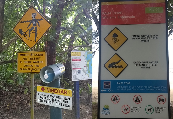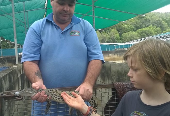 C’est d’ailleurs le seul endroit où nous nagerons dans cette région puisque les côtes sont peuplées de crocodiles, de requins et de méduses venimeuses ! Pas très encourageant d’aller tester la vague dans ce coin Nous irons voir les reptiles de plus près au parc Hartley’s Crocodile Adventure où l’on nous explique que l’animal passe d’une mangrove à une autre en utilisant les courants marins et chasse toutes sortes de proies, allant du petit poisson au dingo, en passant par l’Homme. Les spécimens de plusieurs mètres vus là-bas à l’heure de leur repas sont impressionnants et le claquement de leur gueule quand ils bondissent pour attraper leur nourriture sonne encore à nos oreilles. Chassés à outrance dans les années 70, ils ont même failli disparaitre mais aujourd’hui le problème est inversé et les parcs comme le Hartley les élèvent pour commercialiser leur peau.