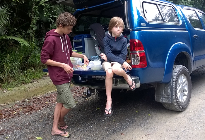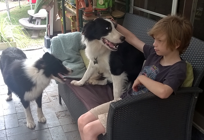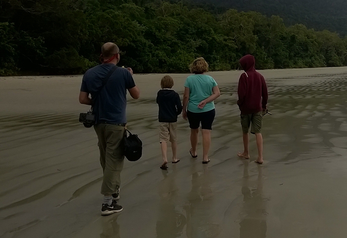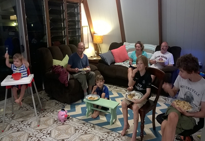 La tribu Andlauer-Cooks nous accueille pour quelques jours à Cairns : Annelyse, Steve, Artair, Louis et Harry, que nous n’avions encore jamais rencontrés, font partie de la famille et vivent en Australie depuis longtemps. Leur disponibilité et gentillesse malgré un emploi du temps bien chargé témoignent encore une fois du sens de l’hospitalité à l’australienne et nous en profitons bien ! Fantin est ravi de jouer au trampoline dans le jardin avec Artair qui vient d’avoir 8 ainsi qu’avec les deux chiens (Ted et Shadow). Annelyse nous a concocté un petit programme afin de découvrir les attraits du nord Queensland : la grande barrière de corail et la rainforest.