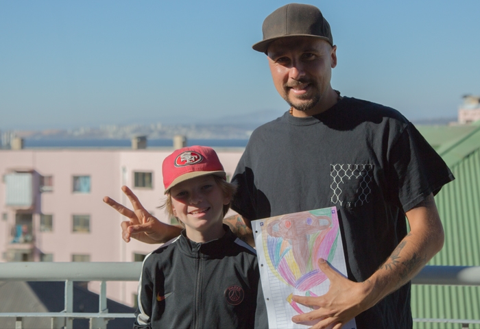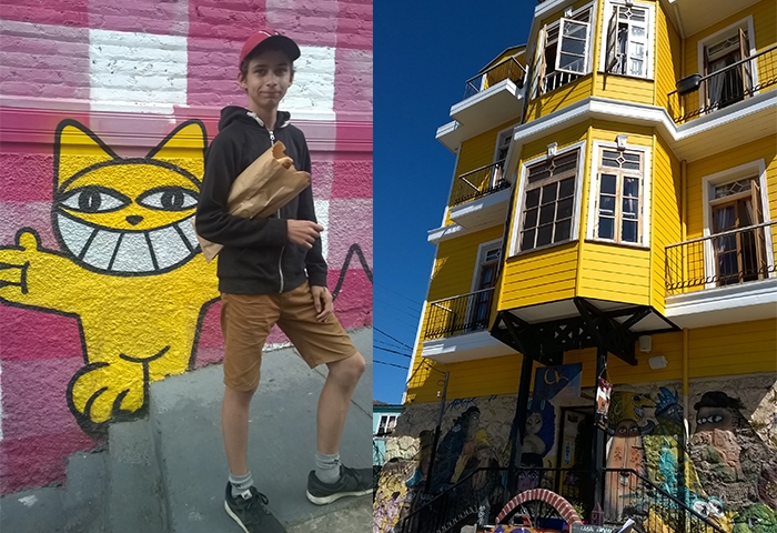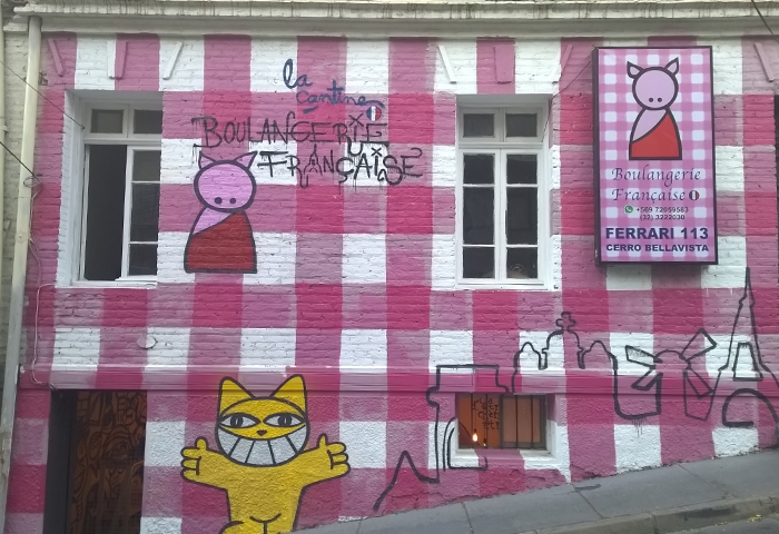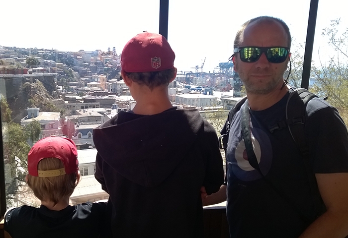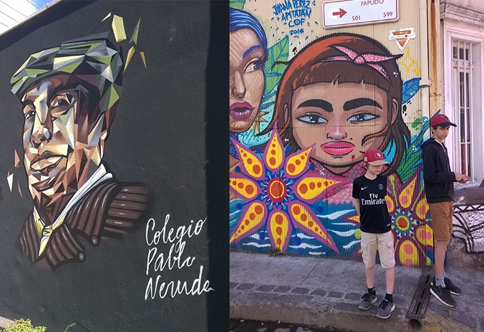 Nous avons même eu la chance de croiser ce dernier grâce à la visite guidée de la ville Valp’Otop rondement menée par Jonathan, un suisse très enthousiaste qui propose un tour de la ville de plus de 3 heures en français. Une aubaine pour nous car les garçons ont pu grâce à lui s’intéresser à l’histoire économique, politique et culturelle d’une manière à la fois ludique et variée sans traîner les pieds ! Némo est même littéralement tombé sous le charme de « Valpo » et compte bien y revenir un jour. Tandis que Fantin y a laissé une petite empreinte en remettant à Cuelli Mangui un de ses dessins que le graffeur lui avait inspiré…. Et puis c’est grâce à Jonathan que nous avons trouvé une sympathique petite boulangerie française fraîchement ouverte au pied de Bellavista et pu nous offrir croissants, pains au chocolat et bonnes baguettes qui commencent à nous manquer pour notre petit déjeuner dominical. La « Sebastiana », l’une des maisons de Pablo Neruda fut aussi une belle visite, le poète/diplomate/prix Nobel ayant un goût de la décoration très éclectique dans cette villa avec vue imprenable sur le port et la mer. Deux jours n’ont évidemment pas suffit à profiter de tous les attraits de cette cité mais en étant idéalement logés dans un joli petit appartement au pied de Cerro Alegre dans Cerro Carcel, nous avons bien optimisé notre temps et profité pleinement !