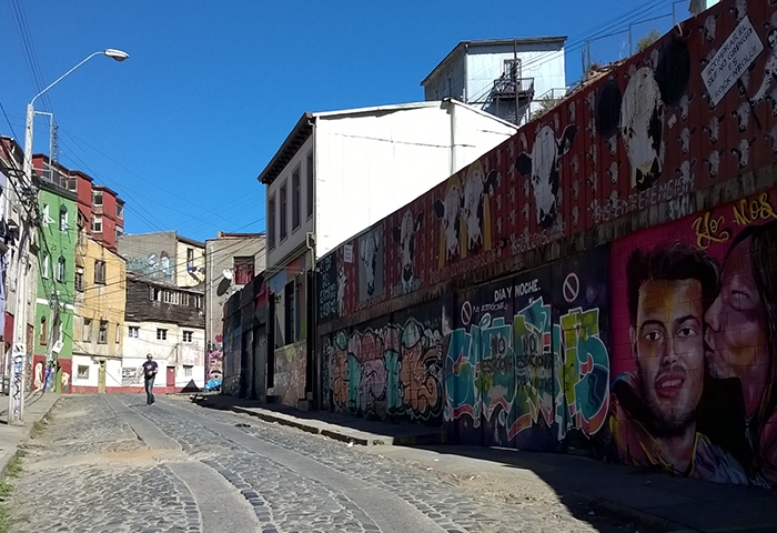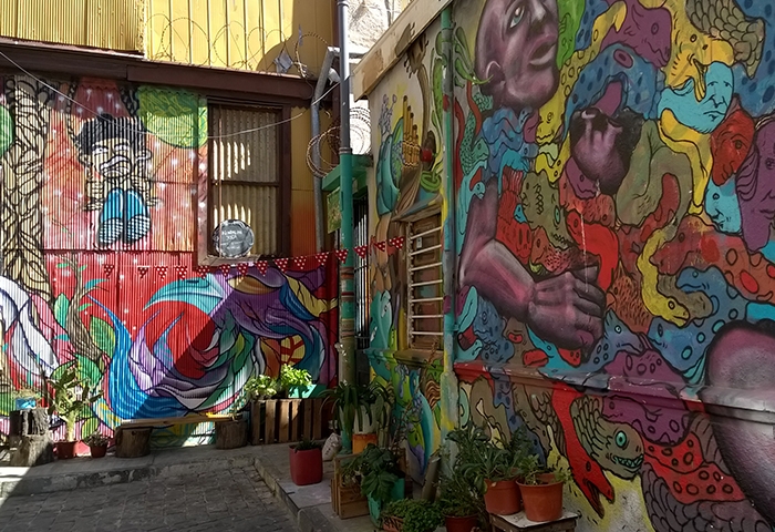 Celle qui fut au 19e siècle la plus grande escale portuaire d’Amérique latine pour les chercheurs d’or européens qui partaient chercher fortune en Californie a un peu perdu de sa superbe aujourd’hui. Mais le charme de Valparaiso est toujours intact même si le canal de Panama a marqué le début du déclin économique de la ville. Aujourd’hui principalement destination touristique depuis son classement par l’UNESCO en 2003 et capitale du Street Art, nous avons beaucoup aimé cette petite ville bohème bâtie entre le vieux port et les collines. Il faut de bons mollets pour l’arpenter car c’est un dédale de ruelles et d’escaliers… Les 8 vieux « ascenseurs » ou funiculaires du début 20eme qui sont encore en activité sont souvent les bienvenus. Valparaiso est un véritable musée à ciel ouvert et dévoile quelques trésors sur ses murs dont les propriétaires accordent aux graffeurs le droit de les couvrir de fresques ou graffitis. Certains l’exploitent comme tribune d’expression comme Charki Punk, défenseur du combat des Mapuche contre le gouvernement pour récupérer leurs terres données à des sociétés qui y plantent l’eucalyptus, ou Marceli qui soutient la cause des pêcheurs de Chiloe asphyxiés par l’élevage industriel du saumon. On y voit aussi les œuvres d’étrangers, comme le français Mr Papillon ou l’espagnol Cuelli Mangui. Cuelli Mangui