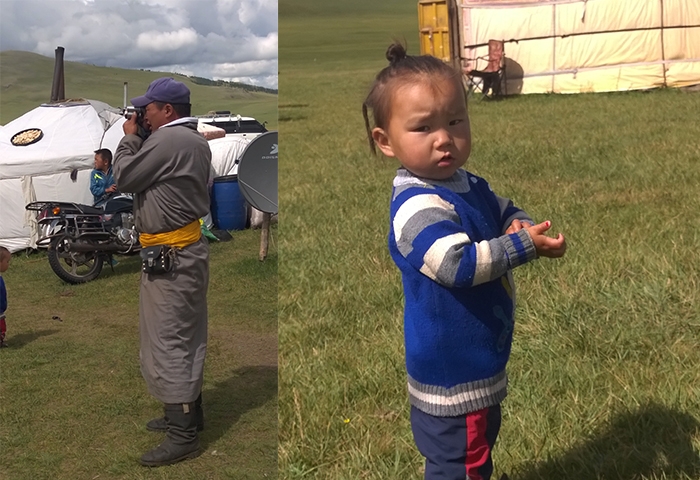Le lendemain nous restons au camp. Le fils de 7 ans de la tante rentre à cheval d’une compétition équestre où il a décroché le premier prix de slalom et partage avec nous la boite de gâteaux qu’il a reçue en récompense. Fantin passera l’après-midi accroché à lui sur sa monture à galoper alentours. Nous avons toute confiance vu le niveau du gamin à cheval déjà à son âge! L’après-midi est également consacré à la préparation des laitages: beurre, yaourt, fromage. Mais aussi la distillation de vodka à base de yaourt de vache. Pendant que leur mère s’active, les deux plus jeunes enfants s’occupent avec ce qu’ils trouvent dans la nature et s’amusent entre eux. Pas de jouet ici et pas de sur-sollicitation, les enfants sont tranquilles et ne réclament pas d’intérêt sans cesse. Ils ne sont pas surprotégés non plus et gambadent tranquillement au milieu du bétail pendant la traite. A l’heure de l’apéro Puujee sort la bouteille de vodka. Il a lavé son van à la rivière l’après-midi et installé la configuration « mini-bar ». Nous commençons à enchainer les shots avec lui, Moogii et deux autres chauffeur et guide arrivés avec une autre famille au camp. Bien mal nous en a pris car nous n’avons pas leur habitude et le lendemain sera très douloureux surtout quand le chef de famille rentré durant la nuit nous souhaite la bienvenue avec un nouveau shot de vodka au réveil !