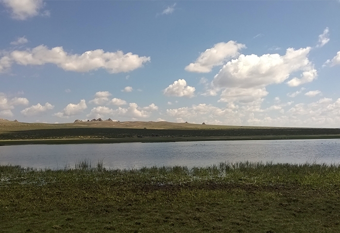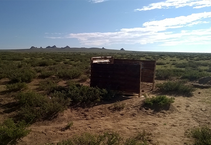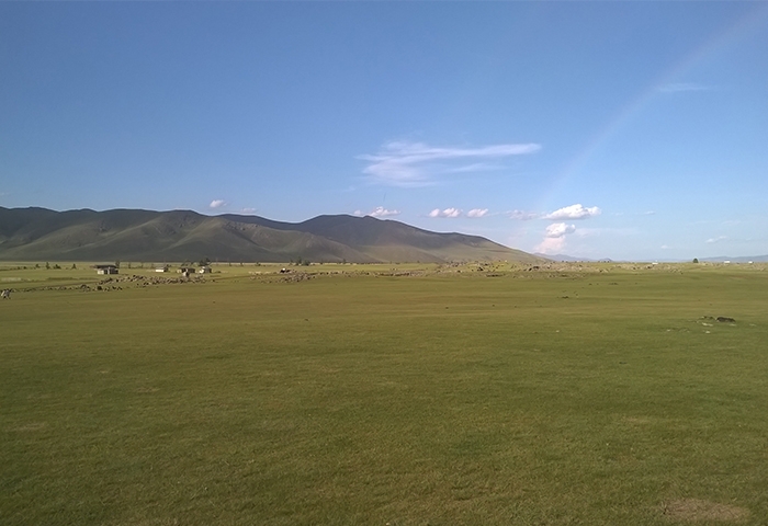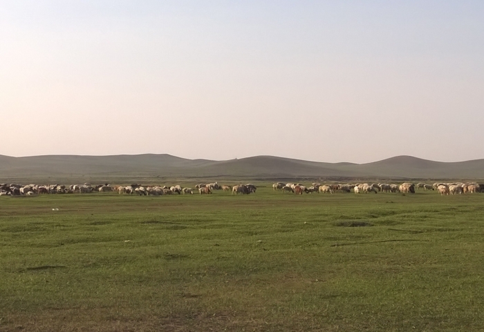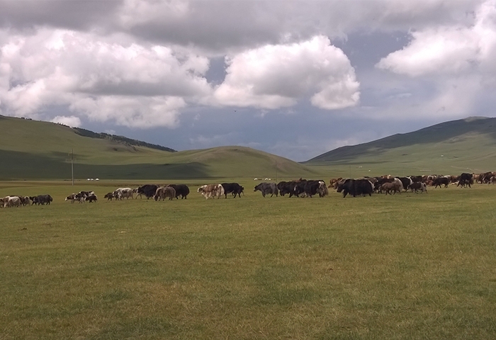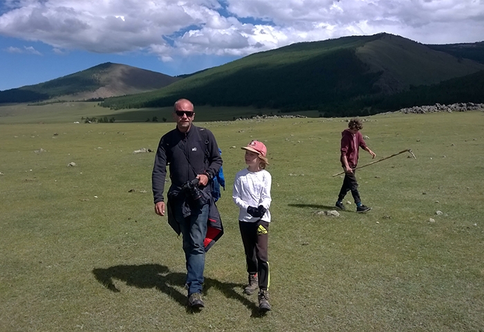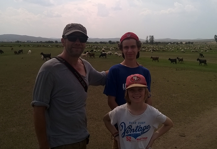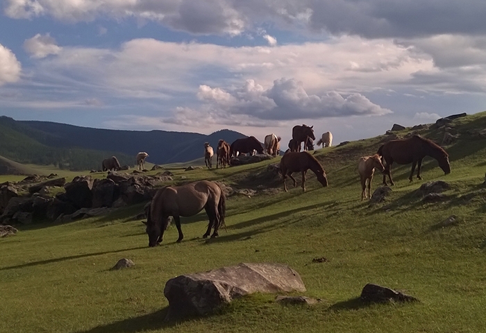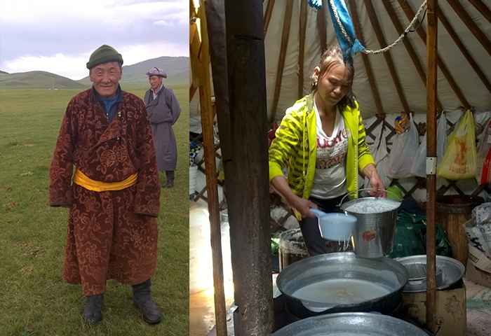 Notre premier voyage au travers des steppes se fait d’abord en train, à bord du transmongolien, la ligne qui prolonge le transsibérien, et qui nous emmène au nord, dans la famille de Shaara, éleveur de chevaux, moutons chèvres et vaches. Nous y sommes logés dans la yourte principale tandis que la famille dort dans la yourte qui fait office de cuisine et goûtons pour la première fois le Airag, lait fermenté de jument, accompagné de fromage mongol sec, l’Aaruul, en guise de bienvenue lors de la cérémonie d’accueil. Ici le temps est ponctué par les tâches d’entretien du bétail et nous devons nous habituer à ce rythme lent (pour nous qui ne travaillons pas !) en attendant le dîner de soupe à la viande et aux pâtes. Avant la traite des 15 vaches, toutes les générations de filles de la famille regardent un soap opéra chinois à la TV reçue par antenne satellite et alimentée par une batterie de voiture. Le lait est vendu chaque matin 600 tugriks le litre au village voisin, soit 0,20 € (le salaire mensuel moyen dans le pays est de 225€). Nous regardons les femmes au travail, essayons chacun de traire à notre tour. Et profitons de ce moment avec elles pour nouer la conversation dans la douceur du crépuscule autour de l’enclos des veaux. Les jeunes hommes rassemblent les moutons pour la nuit près du camp puis s’occupent des chevaux. Ils en ont une trentaine : 2 lots de Mongols pure race et un lot de croisés Arabes. Le fils de 22 ans est un champion et la famille expose ses trophées dans la yourte principale. Nous assistons à leur talent de cavalier en train de débourrer un cheval de 3 ans : lancer de lasso et rodéo ! Très impressionnant…. La nuit nous n’avons pas froid dans la yourte, au contraire, il fait même chaud rapidement le matin. Pendant que les gars dorment encore nous nous installons dehors pour le petit déjeuner et admirons le spectacle des troupeaux sur la steppe à perte de vue.