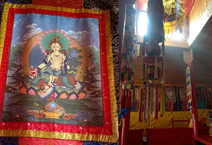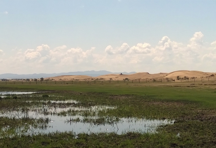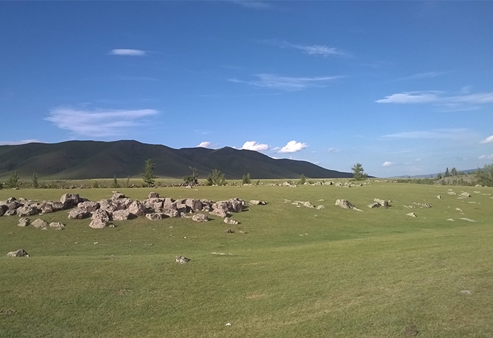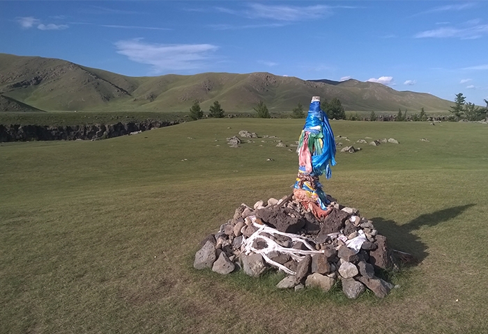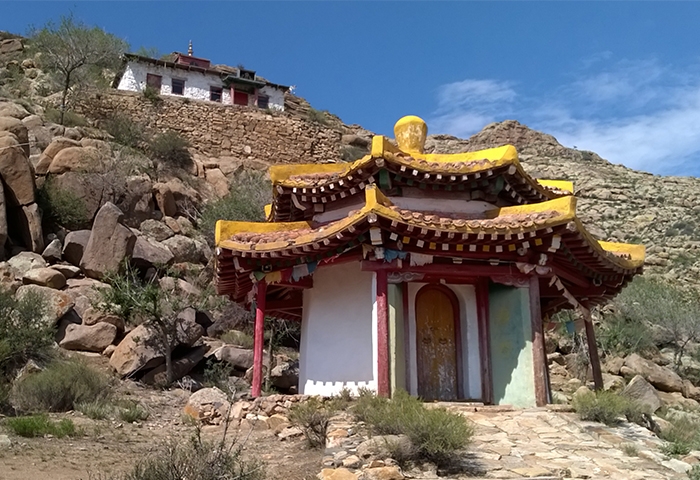 Notre deuxième famille nous accueille au milieu de la réserve naturelle de Khugnu Khan, un écosystème de rencontre entre la steppe et les forêts de la taïga, à proximité de la dune de sable Elsen Tasarkhai, aussi connue sous le nom de « Petit Gobi ». Avec ses 80 km, c’est la troisième plus grande dune de sable du pays, le Gobi faisant 180 km. La famille de Khadaa est composée de 3 filles et 2 garçons, seuls les 3 plus jeunes sont présents. Ils élèvent vaches, chèvres et moutons et nous n’échappons pas à la traditionnelle cérémonie de bienvenue. Mais cette fois le fromage finit discrètement dans nos poches ! Nous partons pour une heure de randonnée à dos de chameau dans les dunes puis visitons non loin du camp un monastère bouddhiste du 16e siècle, Erdenekhamva, accroché à la montagne entre ciel et terre (entre paradis et enfer). Pas très loin un chamane est installé avec un groupe sous un arbre et l’on entend les vibrations de son instrument. Le chamanisme est en recrudescence depuis une dizaine d’années bien que le bouddhisme soit la religion pratiquée par 80% des mongols. La période communiste a bien tenté de l’anéantir en détruisant les monastères et en persécutant les moines, en vain. Nous laissons les garçons rentrer en van avec Puujee et Moogii tandis que nous rentrons à pied : une balade de 7km en fin de journée sous le soleil avec la steppe pour seul horizon.