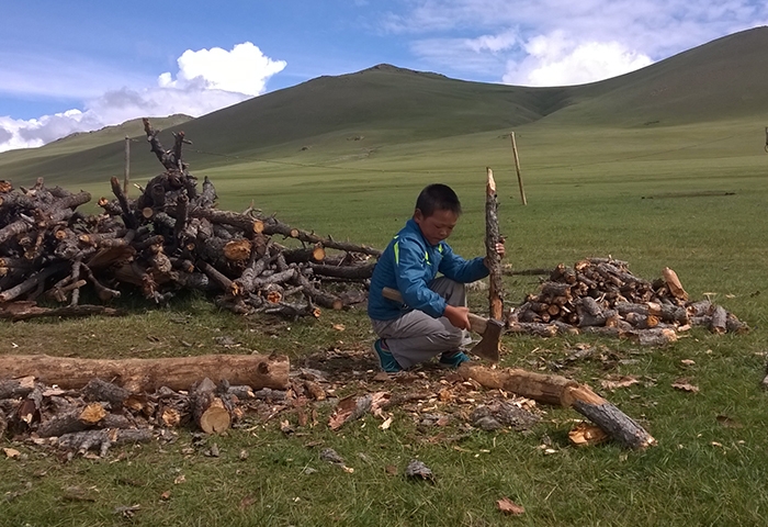 Pour occuper notre matinée nous participons à la confection de gâteaux que la tante retraitée (qui vit dans la troisième yourte du camp) va apporter à ses enfants à Oulan Bator. Ils sont frits dans l’huile au feu de bois dans un petit cabanon ou il fait une chaleur de bête. Puis c’est l’heure de la traite des juments dont le lait permet de confectionner le Airag (lait fermenté excellent pour la santé parait-il). Le midi nous partons tous pique-niquer au bord de la rivière où nous préparons un hot pot de mouton. Les garçons passent le temps l’après-midi en jouant au foot avant une deuxième nuit sous la yourte et le lendemain nous partons à cheval pour une promenade. Les chevaux semi-sauvages mongols sont nerveux et on ne peut pas les arrêter quand ils partent tous au galop sur le chemin du retour au camp. Belle frayeur de maman « Dalton » mais plus de peur que de mal, à part une brûlure à la main de Nemo tellement il tirait fort sur ses rênes pour arrêter son cheval. Tout le monde est resté en selle malgré la course folle à travers la steppe mais c’est les jambes tremblantes que nous avons remis pied à terre. Ces montures ne sont pas des chevaux de balade et ont le sang chaud. On décide de rentrer déjeuner pour recommencer l’après-midi mais l’orage, le vent et la pluie nous obligeront à rester sous la yourte. Les femmes nous convient à les aider dans la confection de sortes de Buuz à la viande que nous partageons à l’abri de la tempête, même si l’eau parvient quand même à traverser le toit. Ce plat traditionnel de fête est un délice.