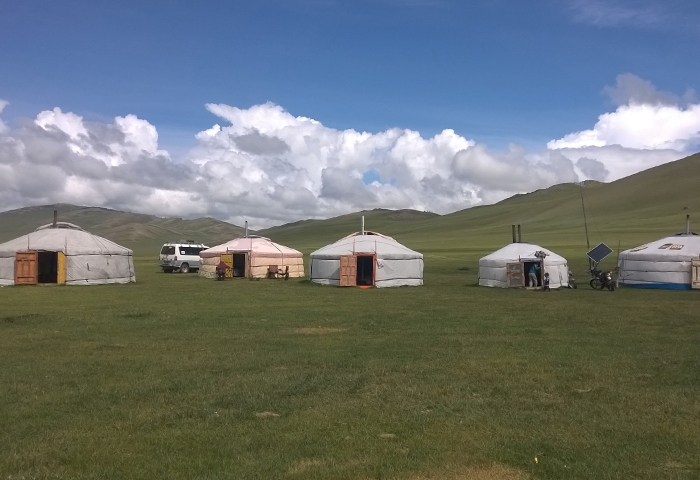 Nous reprenons la route le lendemain matin après un bon petit déjeuner ensoleillé à l’extérieur de la yourte. Avant l’arrivée dans notre troisième camp nomade où d’autres touristes francophones passent la nuit également, nous nous arrêtons dans les bains municipaux pour l’unique douche de notre périple ! Les installations sont sommaires mais nous apprécions l’eau chaude en quantité alors que dans les camps elle est puisée et consommée avec parcimonie. Cette nouvelle famille habite sur les versants méridionaux des monts Khangai, une région montagneuse aux ressources abondantes où les animaux paissent à l’abri du vent. Après le diner de soupe aux légumes et mouton et la partie de foot jusqu’à la nuit nous participons au fameux jeu des doigts (une sorte de « Pierre-Feuille-Ciseaux ») avec la famille et les nomades des alentours à plus de 25 dans la yourte principale. L’équipe perdante doit boire un bol d’airag et nous quittons le jeu après notre première défaite. Les mongols resteront jusqu’à 2h du matin et descendront 50 litres de lait alcoolisé !