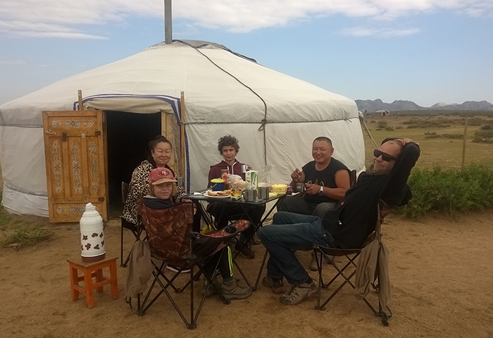 La dynastie des Yuan régna alors depuis Pékin, chassée de Chine par les Ming au XIVe siècle. Les restes du monastère du 16ème aux 108 stupas préservés par les communistes évoquent la grandeur de la ville avant sa chute. Aujourd’hui la ville est plutôt déprimante surtout par temps gris et le changement de programme que l’agence nous propose ne nous convient pas du tout : dormir ici dans une guesthouse de yourtes entourées de parpaings pour notre dernière soirée avec Moogii et Puujee ! On continue donc une centaine de km pour nous arrêter dans le camp que nous connaissons près des dunes de sable. La famille nous accueille dans une nouvelle yourte montée entre-temps dans laquelle ils nous installent le poêle afin de nous réchauffer.Dernier petit déjeuner le lendemain matin face aux dunes, cela vaut mieux que les parpaings et la douche!