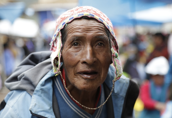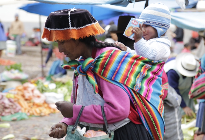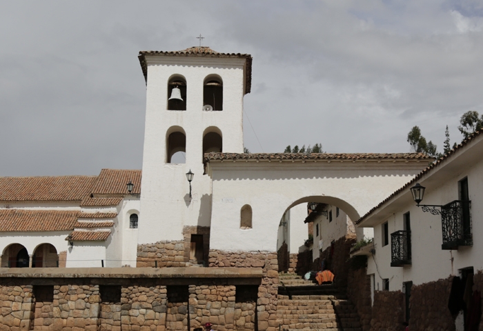 Un petit tour de collectivo vers Urubamba où nous nous régalons d’un poulet accompagné de pâtes au pesto au marché (décidément, les marchés sont les meilleurs endroits pour manger pas cher et savoureux… tant qu’on y attrape pas de salmonellose !) et de forêt noire et autres gâteaux indéfinissables sur les bancs de la place du village où règne une quiétude très apaisante. Cette petite halte nous requinque avant de repartir vers Chinchero en traversant des paysages et scènes de la vie rurale d’un autre temps. Comme l’écrit le guide du routard, on se croirait dans un film de Sergio Leone ! Le village est réputé pour son marché, mais on a surtout apprécié encore une fois les terrasses et particulièrement l’église coloniale du 16ème richement décorée à l’intérieur, un peu dans son jus, mais qui n’a pas quasiment pas bougé excepté l’humidité.