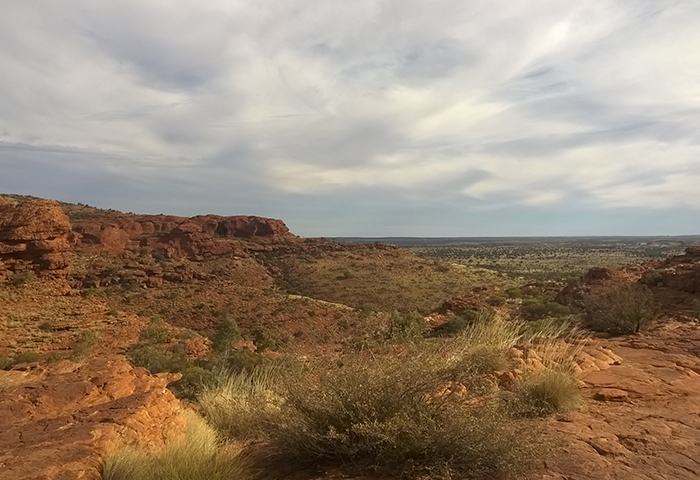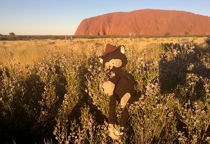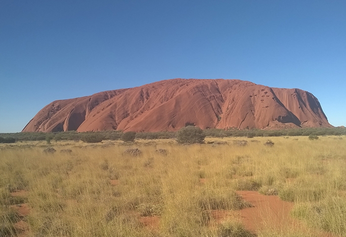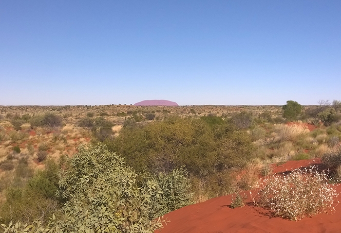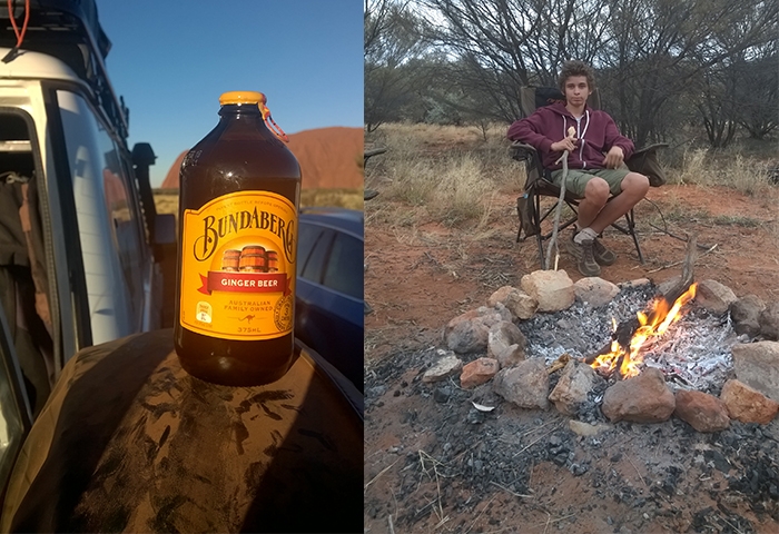 Nous sommes assez proches de Kings Canyon quand nous reprenons la route et parviendrons à enchainer par une petite randonnée dans le parc national Watarrka que l’on compare parfois au Grand Canyon américain, formé il y a 350 millions d’années et composé des anciennes dunes de sable de Mereenie. Les gorges atteignent une profondeur de près de 300 mètres mais nous n’aurons pas le temps de faire la plus grande marche qui permet d’y aller et nous contentons de grimper jusqu’au sommet via la South Wall return walk avec une belle lumière rasante de fin de journée. Seules les mouches entament le plaisir de la marche car elles sont très envahissantes, à vous chatouiller le visage sans cesse, ou bien il faut se résoudre à porter la moustiquaire de tête un peu ridicule pour s’en protéger ! Désormais bien rôdés à l’installation de notre camp, nous trouvons un site de camping sauvage encore plus sympa que la veille, à l’écart de la Luritija road, où nous ferons même griller des mashmallows au feu en guise de dessert. La nuit sera un peu moins fraîche que la précédente mais toujours aussi calme. Avec une distance de 320km entre Kings Canyon et Uluru (Ayers Rock en aborigène), nous parvenons au fameux rocher sacré le troisième jour, suffisamment tôt pour assister au coucher du soleil mais malheureusement pas assez pour pouvoir en faire le tour avant. On trouve donc une place pour assister aux changements de couleur, du brun au violet en passant par une palette d’Oranges, après une visite du centre culturel aborigène. C’est quand même cher payé pour nous, le pass à 25$ par personne, valable certes 3 jours, mais dont ne pourrons pas profiter car notre avion nous attend le lendemain. On profite donc au maximum du sunset comme les dizaines de touristes, parqués dans une zone dédiée, l’apéritif en poche pour les 2 heures de spectacle. C’est beau, c’est vrai… mais un peu frustrant de passer à côté du reste du parc qui a beaucoup d’autres points de vue à offrir. Tant pis !