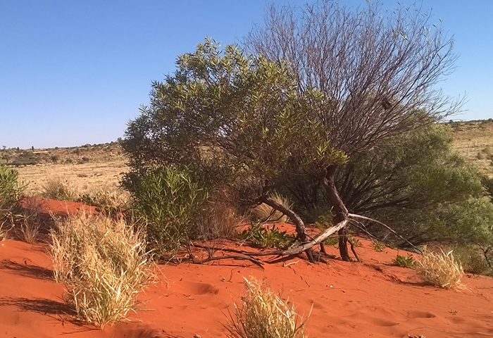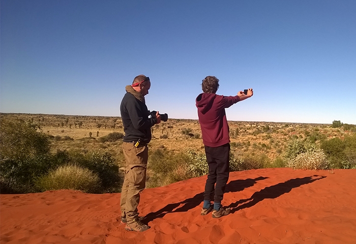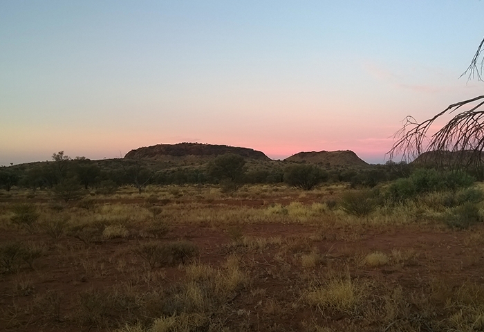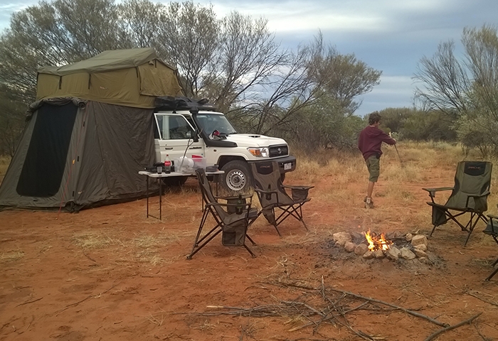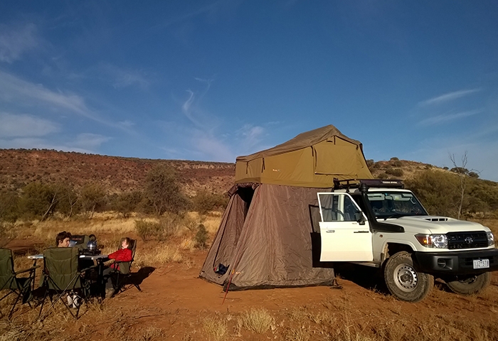 On s’en sort pas trop mal en moins d’une heure pour notre baptême, pile ce qu’il faut pour sortir les bières et le coca du frigo intégré au 4×4, déplier la table et les chaises et profiter du soleil rougeoyant qui décline. Malgré les réticences de la maman rabat-joie qui veille constamment au respect des règles de sécurité locales, les garçons creusent un trou au milieu des herbes sèches pour y allumer un feu avec le bois mort à disposition trouvé aux alentours. C’est vrai que cela change l’ambiance tout à coup, et que la veillée en famille autour du feu au milieu du désert prend une autre dimension quand Arnaud et Némo racontent leurs histoires. Au moment du coucher, nous sommes bien couverts pour rentrer dans nos gros duvets (les enfants sur le toit et les parents sur la tente au sol) car les températures sont déjà fraiches. La nuit sera courte pour les adultes réveillés par les bruits des animaux qui rôdent un peu trop près de la tente à leur goût et dont on ne saura jamais ce qu’ils étaient au final ! Peut-être des chevaux au regard des traces à proximité découvertes le lendemain matin. Mais le silence et l’obscurité de la nuit étant propices aux déambulations de l’esprit, toutes sortes d’animaux sont passées dans nos têtes ! Le lendemain le spectacle du soleil matinal sur la savane est juste incroyable pour notre petit déjeuner avant la séance de remballage du dispositif de campement. Chacun trouve son rôle, une vraie petite équipe ! Seule une poignée de colons s’est aventurée dans ce désert, en chameaux avant 1961 alors qu’il n’y avait pas encore de route, jusqu’à ce que la famille Cotterhill, subjuguée par la beauté de ces espaces s’installe à Stuart Hill et initie le début du tourisme dans ces territoires.