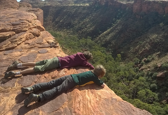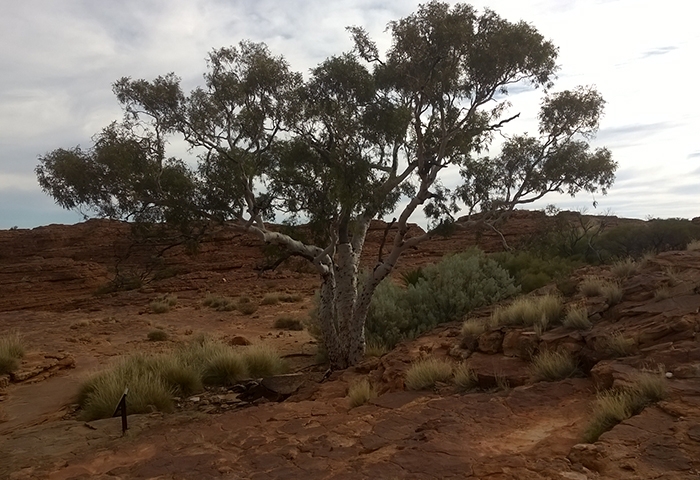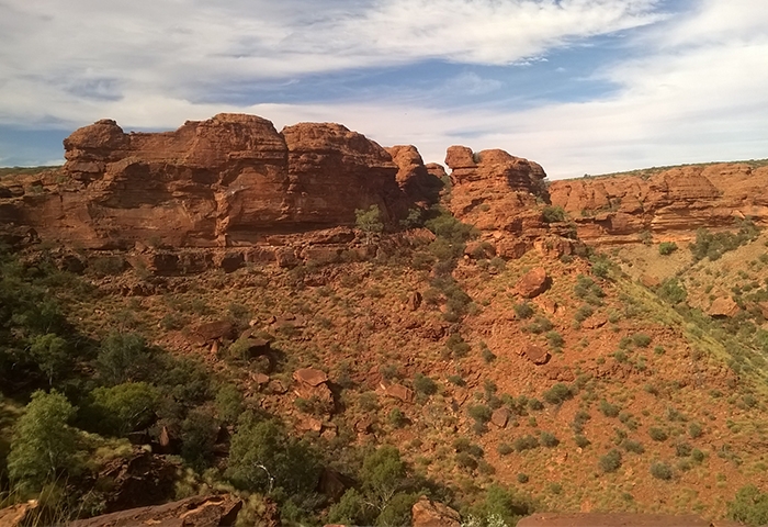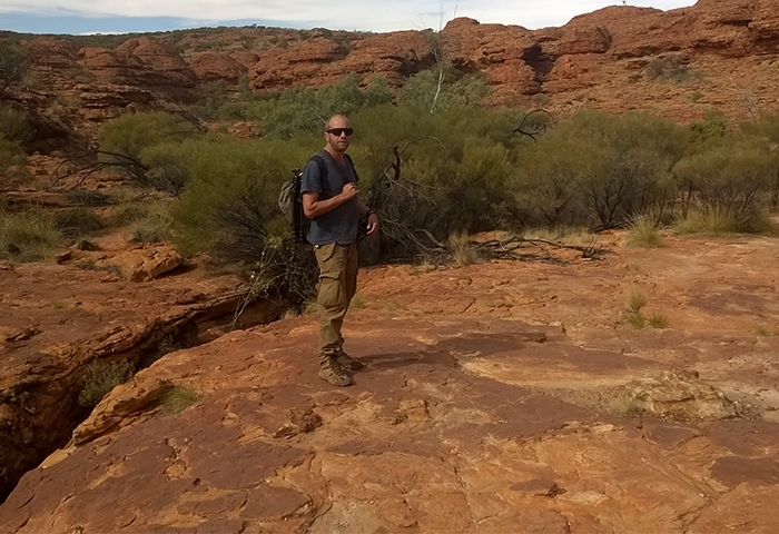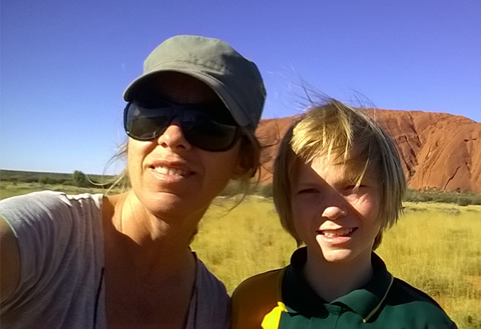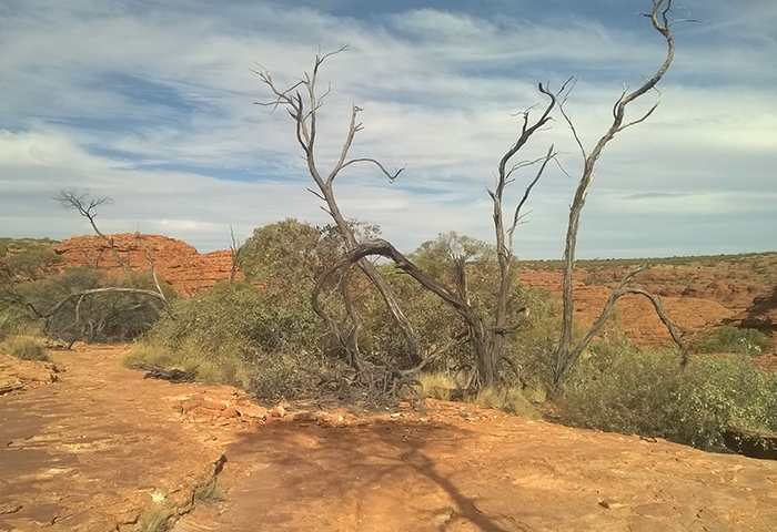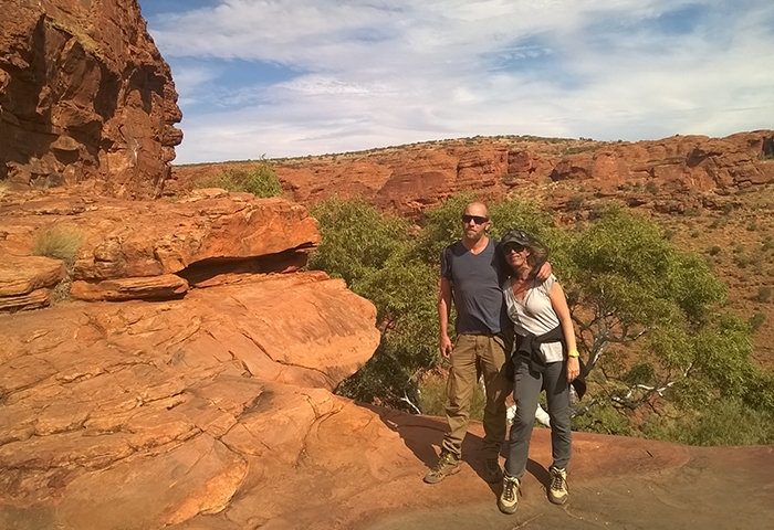 Le mythique centre rouge, l’Outback, est sans doute la région qui nous vient en tête quand on pense à l’Australie. Un territoire immense, grand comme les deux tiers de l’Europe…. Où vit moins de 5% de la population dont une bonne partie des aborigènes. Nous n’avions pas suffisamment de temps pour faire le road-trip depuis la côte mais nous tenions vraiment à visiter cet endroit. Nous n’avons pas été déçus ! Un vrai de cœur pour cette expérience… Un vol Cairns-Alice Springs permet d’y accéder en moins de 3 heures. De là, nous avons pris les rênes de notre 4×4 Landcruiser Camper pour 3 jours de route sur les terres ocres. Les points de visite les plus connus comme Uluru et Kings Canyon sont reliés par une route bitumée mais il est possible de réduire les distances via des pistes, d’où l’intérêt du 4×4. Après un ravitaillement au supermarché de Alice Springs (indispensable car ensuite il est difficile de trouver quoi que ce soit), nous avons commencé notre virée sauvage dans le centre rouge. C’est surtout le road-trip qui nous a subjugués : des centaines de kilomètres en ligne droite dans un décor de film, entre savane africaine et Colorado, en croisant très peu de véhicules sur les pistes. On se sent vraiment tout petits et perdus au milieu du gigantisme et l’hostilité de ce territoire, mais c’est ça qui est bon justement ! Etre remis à sa juste place par la Nature ! Quelques animaux ont réussi à s’adapter au climat et à cette végétation, tels les brumbys, (chevaux sauvages), dingos, dromadaires, kangourous, rapaces et autres méchants reptiles. Côté climat, l’automne est plutôt frais en comparaison du reste de l’année, mais bien appréciable pour nous : temps bien ensoleillé mais pas trop chaud dans la journée et nuits très fraîches qui descendent en-dessous de zéro. Malgré la demi-heure de décalage horaire en moins avec Cairns (nous ne savions même pas qu’il existait des fuseaux de moins d’une heure !!!), nous ne parvenons pas à atteindre Kings Canyon à 450 km de Alice Springs avant le coucher du soleil le premier après-midi et devons-nous résoudre à trouver un campement sauvage aux abords de la Mereenie Loop road avant la nuit car le premier montage de notre tente nous attend. Pas compliqué en soi mais quand on ne l’a jamais fait, les tentes sur le toit et le côté du véhicule cela ne s’improvise pas.