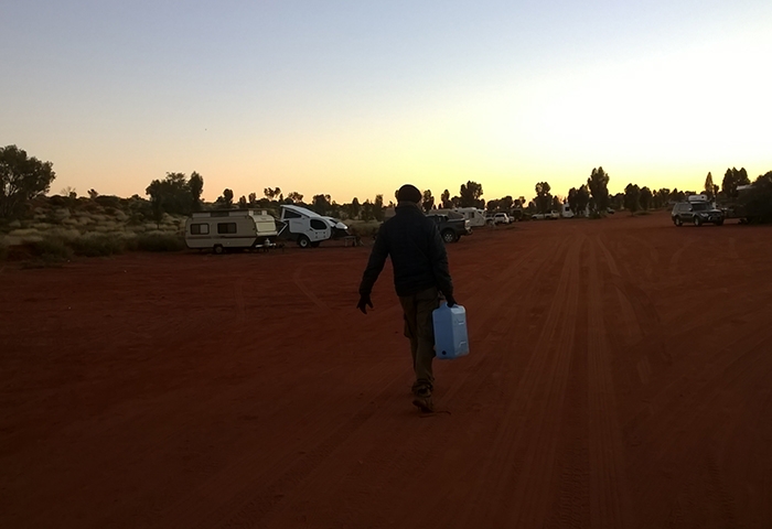 On ne regrette pas de l’avoir vu quand même. Et la nuit venue, comme tous les touristes, nous devons nous contenter de nous installer au camping de Yulara car impossible de chercher un site sauvage en pleine obscurité ! Le contraste est désarmant avec nos deux nuits précédentes puisque nous devons supporter le ronronnement d’une usine à proximité du terrain où les 4×4 campers comme les nôtres sont installés. Nous sommes vraiment des petits joueurs avec notre modèle Landcruiser. Ici, les australiens ne lésinent pas avec les moyens côté équipement de camping ! Cuisines équipées rétractables, niches tractées pour les chiens, champignons chauffants ou braseros,…. On se contentera de préparer nos pâtes bolognaises le plus rapidement possible sur nos réchauds avant d’avoir trop froid et de vite nous coucher ! Le lendemain c’est près de 500 km que nous devons descendre, sur route asphaltée afin de ne pas perdre trop de temps, et attraper notre avions retour à Alice Springs en fin d’après-midi (où nous retrouverons quand même la casquette de Némo oubliée dans l’avion 4 jours plus tôt !). On regrettera de ne pas avoir prévu plus de temps dans le désert rouge et nous promettons de revenir un jour.