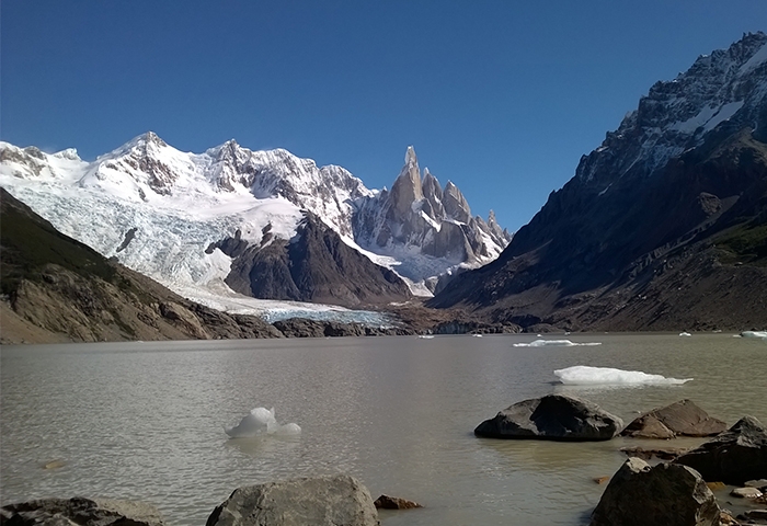 Tres, au pied de son glacier, au terme du dixième kilomètre de montée avec plus de 400 mètres de dénivelé ! Bonjour les fessiers ! Après 10 heures de sortie ce jour-là où ils n’ont pas failli, Fantin et Némo auront le droit à une journée entière de temps libre de récupération. Leurs jambes ne bougeront pas beaucoup ce jour-là… mais plutôt les doigts !!! Et de repartir le jour suivant pour une marche de 9 heures tout aussi splendide en direction du Mont Torre, jusqu’à la Laguna Torre, lac dans lequel flottent quelques gros glaçons qui se sont détachés du glacier. On ne s’en lasse pas…
