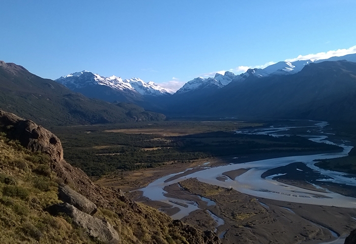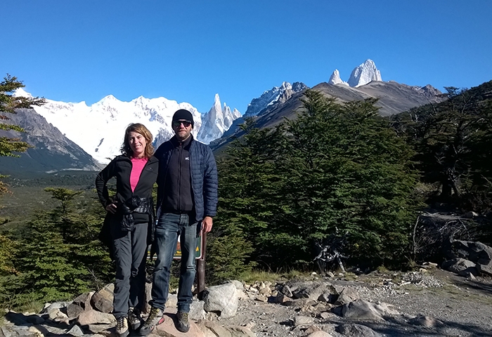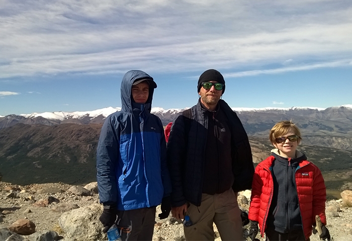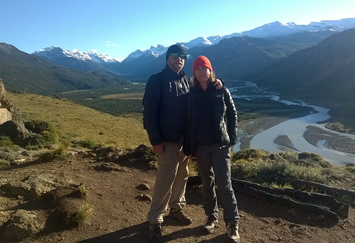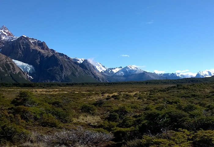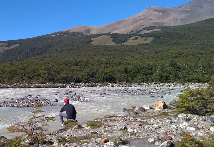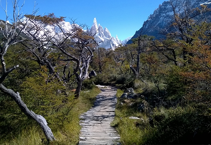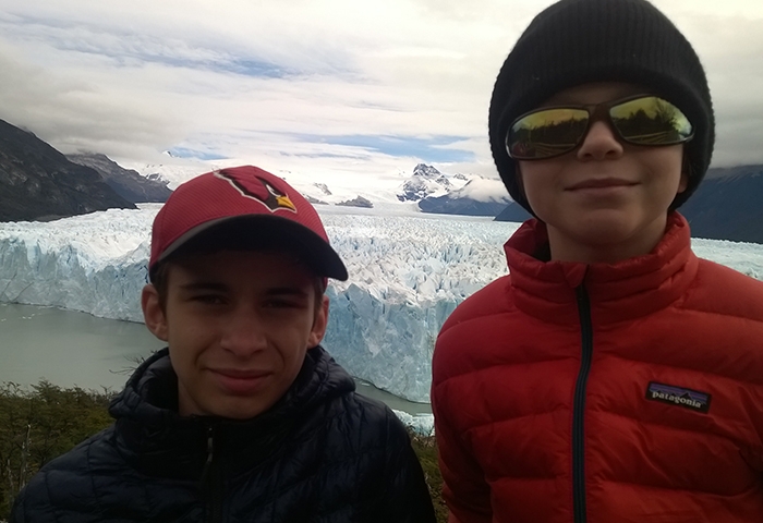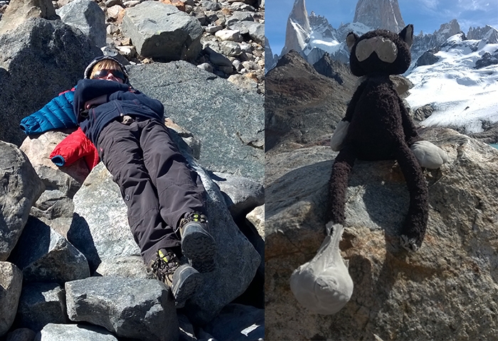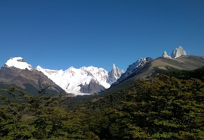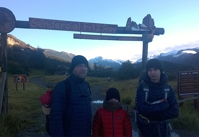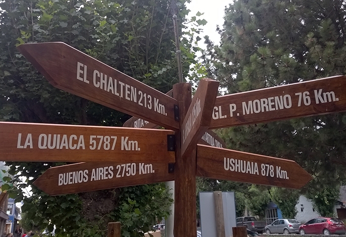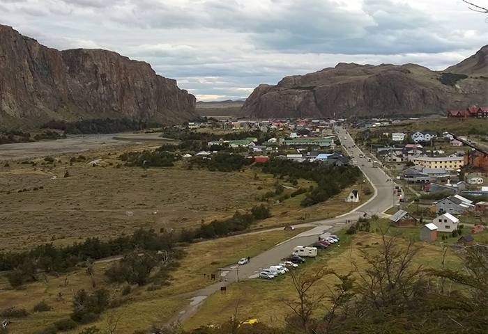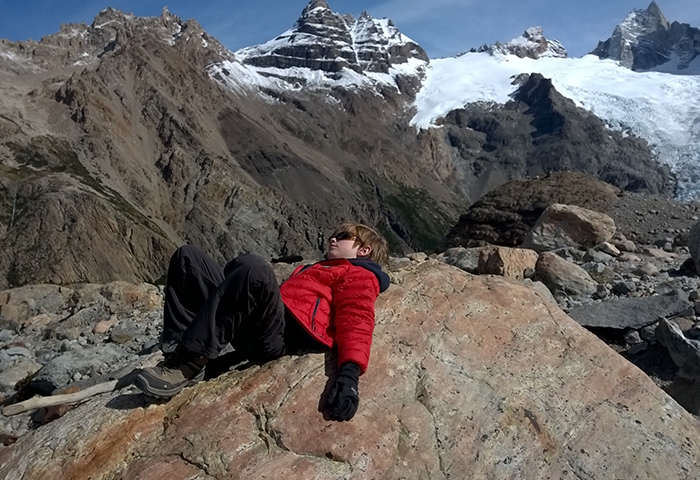 A 3 heures de bus, nous nous rendons ensuite dans la Mecque des marcheurs et des grimpeurs : El Chalten, facilement accessible désormais avec une portion goudronnée de la fameuse route 40, et où, étonnamment nous croisons beaucoup de français. C’est aussi semble-t-il l’une des villes les plus chères d’Argentine concernant l’hébergement ! Mais elle un a un véritable atout : elle est située au cœur du Parc National Los Glaciares. Nous avons même droit à un stop briefing du bus avant d’entrer au cœur du village sur les consignes de sécurité pour le préserver ! Ici, c’est le royaume de la marche et on a fait le plein ! Avec des chemins balisés mais toutefois encore très sauvages, on peut dire que les garçons ont assuré avec plus de 40 km de ballade en deux jours. Sous un ciel bleu et un soleil brillant, nous avons même eu la chance assez rare d’admirer le mont Fitz Roy totalement dégagé (celle qu’on appelle aussi « la montagne qui fume » en faisant allusion aux nuages souvent accrochés à son sommet) et pique-niquer au bord de Lagos de Los