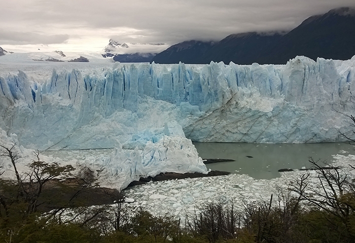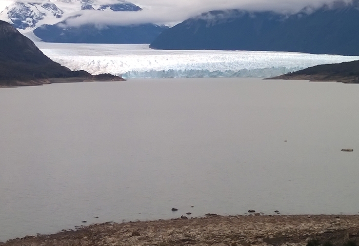 Nous appréhendons donc cette région par le sud, à 80 km du Perito Moreno, au pied de la cordillère des Andes et au bord du Lago Argentino, par cette ville-étape au cœur de la pampa herbeuse et venteuse. La location d’une voiture revenant moins cher qu’un transfert en bus pour nous quatre, notre première expédition ne sera pas des moindres ! Approcher au plus près la fameuse ligne de rupture du Perito Moreno, dans l’une des régions de glaciers les plus grands au monde avec 48 glaciers majeurs depuis les fjords du Pacifique au Chili à l’ouest jusqu’aux lacs argentins à l’est, sur une surface de 12 000 km2. Pour cela il faut entrer dans Le Parc National Los Glaciares à 1h30 de route de El Calafate. On aperçoit déjà l’immensité du champ de glace et ses reflets bleus 7km avant même d’arriver au site, la partie visible montant jusqu’à 70 mètres de hauteur sur 5000 mètres de large.