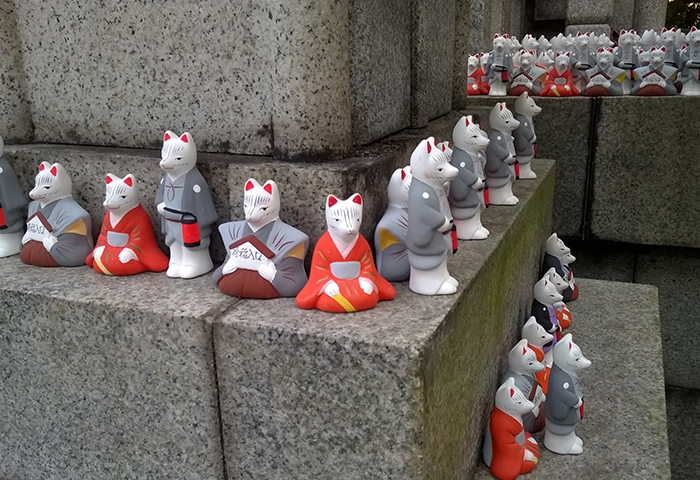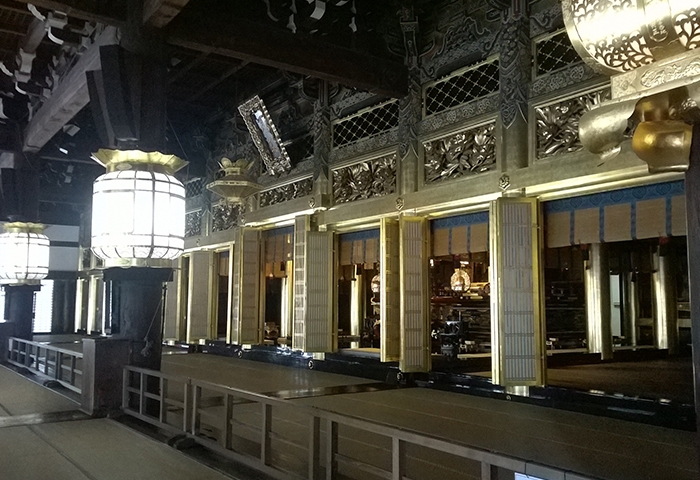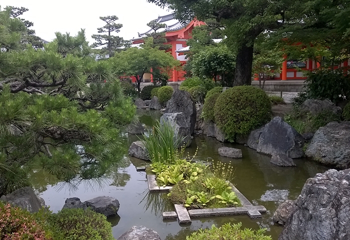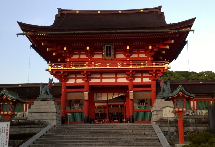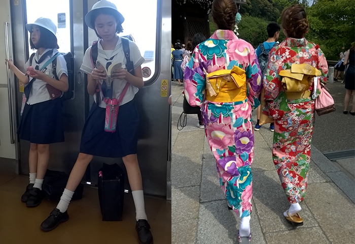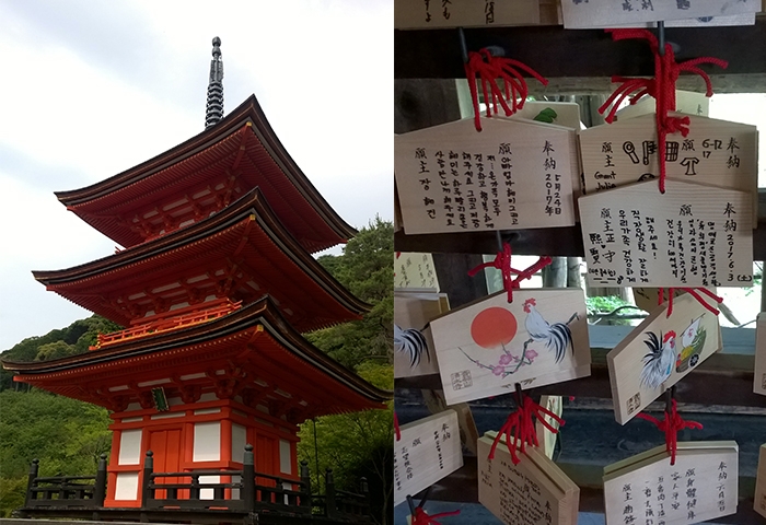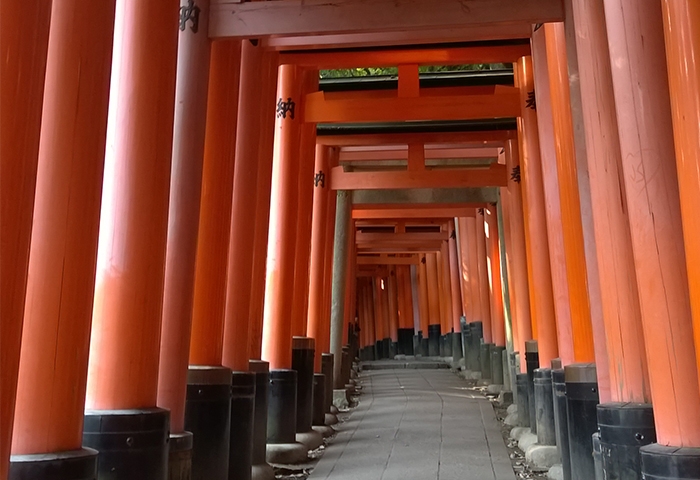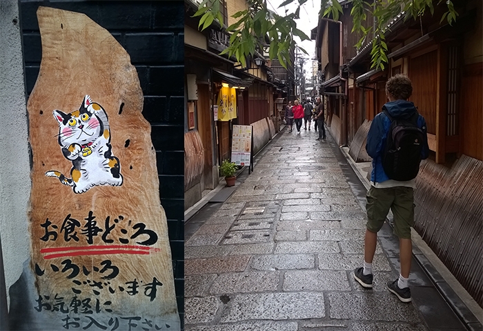 Ancienne capitale de l’Empire, Kyoto contraste par son calme après l’effervescence tokyoïte. C’est pourtant une grande ville, avec plus de 1,5 millions d’habitants, située dans la région du Kansai, sur l’île principale de Honshù. Pas de néons ici mais des ruelles et des petites maisons basses comme on se l‘imagine dans ce pays. Nous y restons 5 jours pour prendre le temps de visiter quelques temples et sanctuaires innombrables dans la ville et ses alentours. Entant logés à proximité, nous commençons notre marathon culturel par Nishi Hongwan-ji, le temple mère du courant boudhique Jodo établis au 12è siècle. Datant du 17ème le Goeido est l’une des plus grandes structures en bois du Japon. Avouons que nous n’y connaissions rien avant de le visiter, mais on aime bien de temps en temps faire genre dans le blog ! Et ça nous permettra de nous en rappeler plus tard… Et dans la catégorie structures monumentales, le temple aux 1001 Boudhas, le Sanjunsangen-do, est lui aussi impressionnant avec une bâtisse en bois de cyprès du Japon du 12ème inchangée depuis 700 ans, la plus longue dans sa catégorie dans le pays avec ses 120 mètres de long. Pas de photo possible au sein de ce trésor national qui expose donc 1001 statues de Boudha, comme son nom l’indique, que l’on aperçoit perdus au milieu des groupes scolaires venus les admirer.