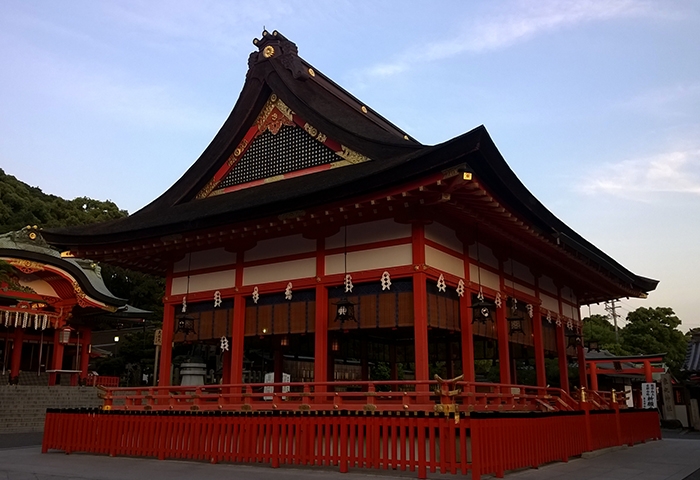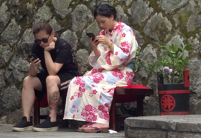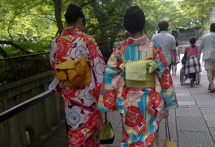 Nous poursuivons avec le Kiyomizudera, un complexe syncrétique comprenant un temple bouddhique et un sanctuaire shinto, situé dans le quartier de Higashiyama à l’est de Kyoto. Il constitue l’une des visites les plus populaires de la ville, donc forcément on n’est pas seuls ! Dommage que le site soit toujours en rénovation (et cela depuis plusieurs années) mais c’est ici que l’on peut voir le plus de japonais en visite dans leur kimono ! Il y d’ailleurs plusieurs boutiques de location alentours mais nous n’avons pas osé le ridicule de certains occidentaux qui comme eux revêtent l’habit traditionnel à l’occasion. C’est dingue comme la démarche à petit pas dans les sandales à semelle de bois ne s’improvise pas ! Les japonais, eux, savent en revanche combiner tradition et modernité car tous se prennent en photo avec leur smartphone, fiers de leur habit…. Une fois la visite terminée, ce site haut perché offre l’opportunité d’une ballade en descente vers le quartier de Gion, au travers de ruelles très pittoresques et bien agréables bien que bordées de boutiques souvenirs. On aura beau épier, pas beaucoup de véritables Geisha ni de Maikos (apprenties Geisha) en vue dans ce quartier en début de soirée…. Elles sont pourtant encore près de 200 à officier à Kyoto, en consacrant leur vie à la pratique artistique raffinée des arts traditionnels japonais pour des prestations d’accompagnement et de divertissement destinées à une clientèle très aisée. Ces dames de compagnie, qui ne sont pas des prostituées, cultivent le raffinement artistique dans divers domaines tels que l’habillement en kimono, la musique classique, la danse, les rapports sociaux et la conversation, des jeux… On aurait bien aimé en profiter mais c’est hors budget ! Nous sommes quand même sous le charme de Gion où nous ne pouvons nous empêcher de nous rappeler l’histoire dramatique de Chiyo racontée dans le superbe roman d’Arthur Golden, « Mémoires d’une Geisha ».