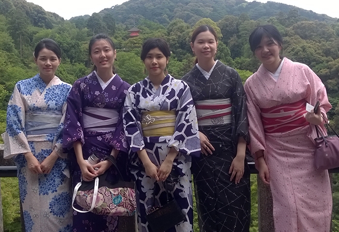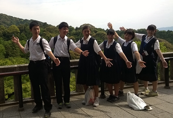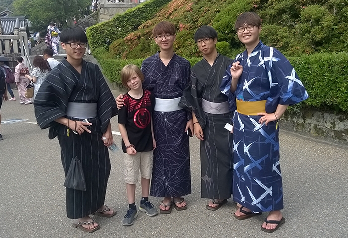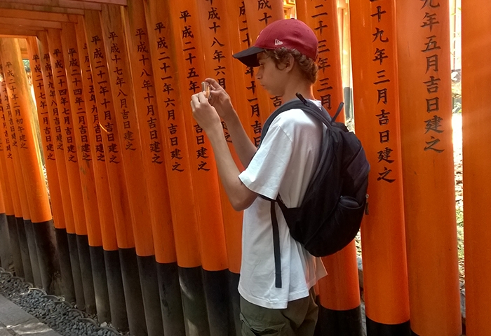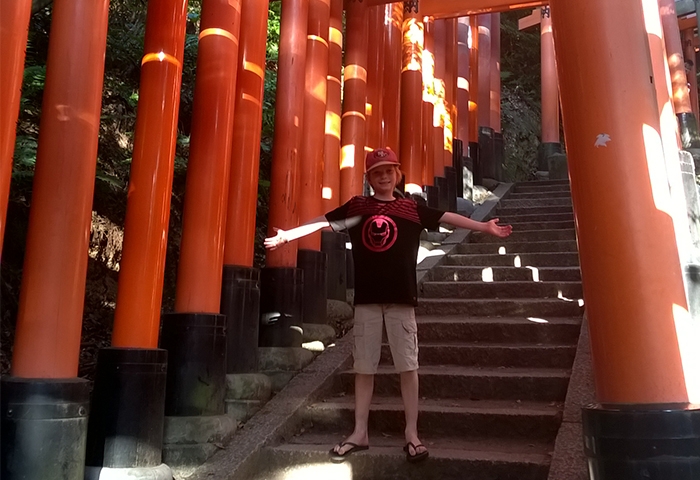 Nous aurons beaucoup moins de monde en terminant notre pédalage jusqu’au plus ancien dojo du Japon, le « vieux » Butodoken, où nous avons discrètement assisté à un cours de Naginatajutsu (respectueusement assis sur les tatamis, aïe… ça fait mal aux genoux ! ), un art martial japonais maniant une sorte de hallebarde, davantage pratiqué aujourd’hui par les femmes car à l’origine il était enseigné aux femmes de samouraï pour leur permettre de défendre leur maisonnée. Notre dernière expérience à Kyoto sera évidemment une cérémonie du thé. Quel meilleur endroit pour y assister ? Accueillis dans la maison de thé En, dans le quartier de Gion, nous y découvrons les différentes étapes de cet art mais pouvons aussi  le pratiquer à notre tour en petits groupe de 6 personnes. Les kids n’ont pas forcément apprécié l’amertume du matcha mais ils ont été bien attentifs et respectueux tout au long de la démo, on est trop fiers d’eux !